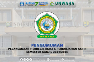 Diberitahukan kepada seluruh mahasiswa/i Universitas KH. A. Wahab Hasbullah Tambakberas Jombang hal-hal sebagai berikut: Herregristasi mahasiswa (Cetak KRS & KHS) di sia.unwaha.ac.id mahasiswa smt 3, 5 & 7 dilaksanakan tanggal 12 – 26 September 2024. Untuk mahasiswa baru (mahasiswa smt 1) yang telah melaksanakan herregristrasi, secara otomatis akan di KRS-kan (Kartu Rencana Studi) oleh tim […]