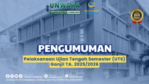 Diberitahukan kepada seluruh mahasiswa Universitas KH. A. Wahab Hasbullah (UNWAHA) bahwa pelaksanaan Ujian Tengah Semester (UTS) Ganjil Tahun Akademik 2025/2026 akan dilaksanakan pada: Tanggal: 1 – 6 November 2025 (sesuai jadwal perkuliahan masing-masing)Pelaksanaan: Secara offline/tatap muka Ketentuan: Demikian informasi ini disampaikan untuk menjadi perhatian bersama, terima kasih. Pengumuman dapat diunduh di sini.
