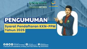 Berdasarkan Surat Pengumuman No: 406/A/KKN-PPM-UNWAHA/S.Png/VI/2025 tentang Syarat Pendaftaran Kuliah Kerja Nyata, Pembelajaran Pemberdayaan Masyarakat (KKN-PPM) tahun 2025, diberitahukan kepada mahasiswa semester VI (enam) syarat pendaftaran sebagai berikut: Demikian pengumuman ini disampaikan, atas perhatian dan kerjasamanya disampaikanterimakasih. Surat Pengumuman Pelaksanaan KKN-PPM Tahun 2025.