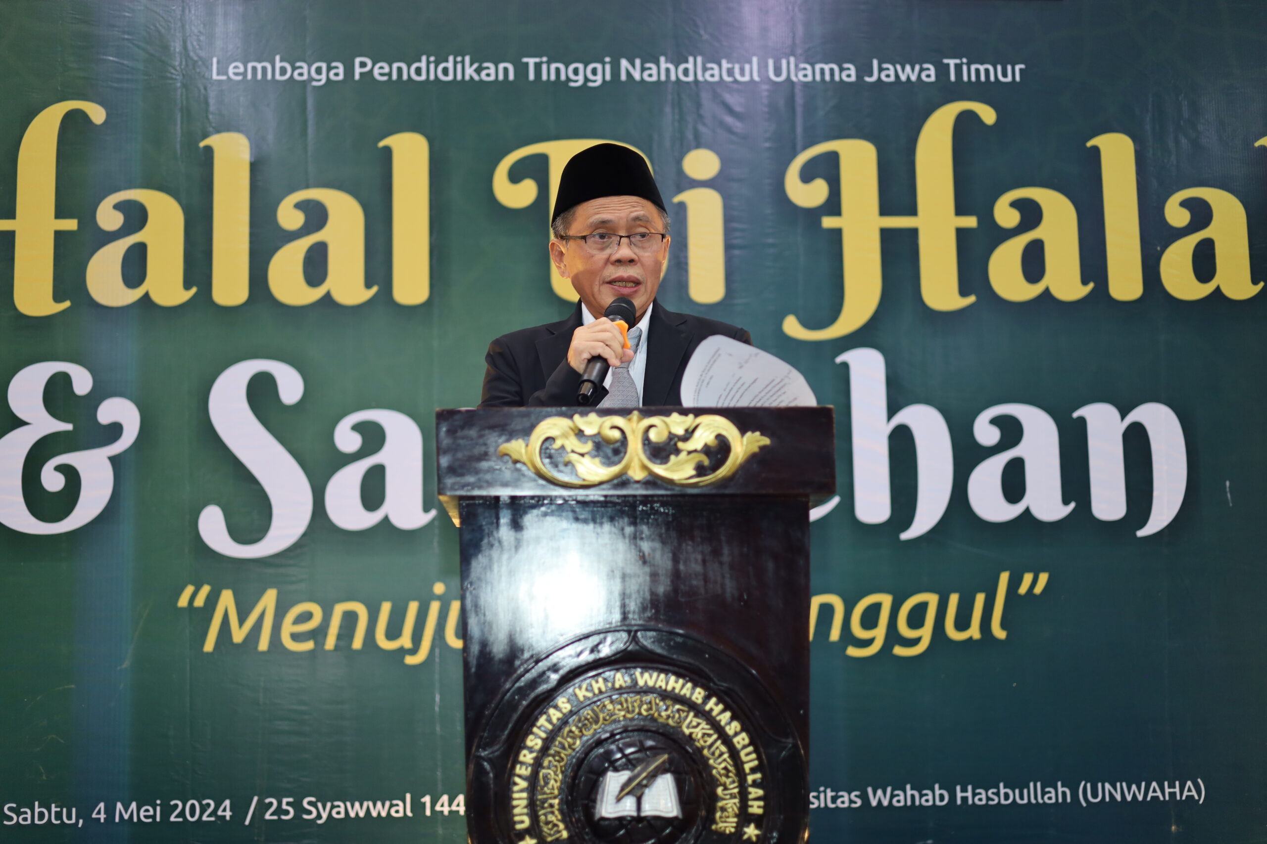 Di kesempatan yang sama, Rektor Unwaha Jombang, Prof. Dr. Ir. H. Gatot Ciptadi, DESS, IPU, ASEAN Eng. mengucapkan syukur dan terimakasihnya kepada seluruh peserta yang hadir. Khususnya kepada LPTNU Jatim yang telah memberikan kepercayaan kepada Unwaha Jombang sebagai tuan rumah Halal Bihalal LPTNU tahun ini.
