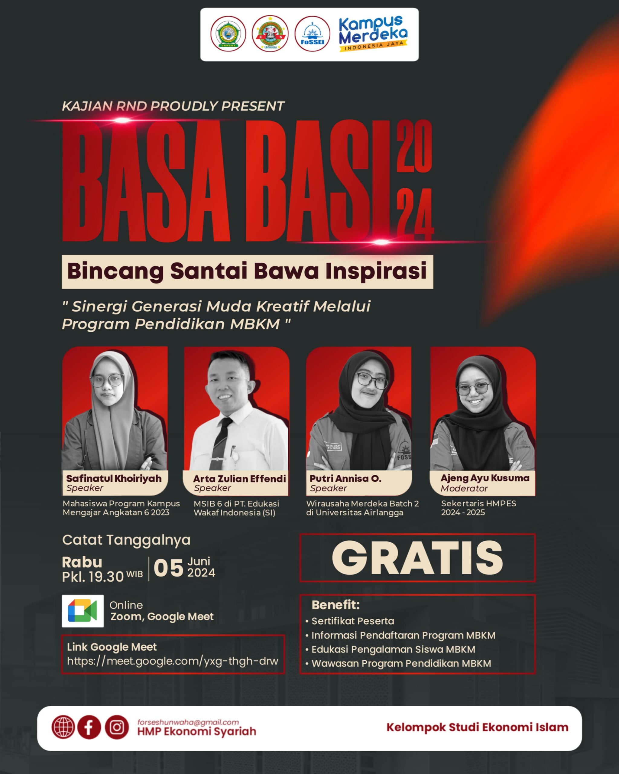 Jombang – Himpunan Mahasiswa Prodi (HMP) Ekonomi Syariah menggelar kajian rutin Bincang Santai Bawa Inspirasi (BASA-BASI), Rabu (5/6/2024) lalu secara daring. Kajian kali ini mengangkat tema “Sinergi Generasi Muda Kreatif Melalui Program Pendidikan MBKM”.