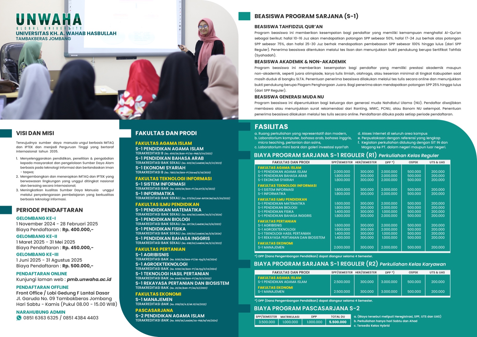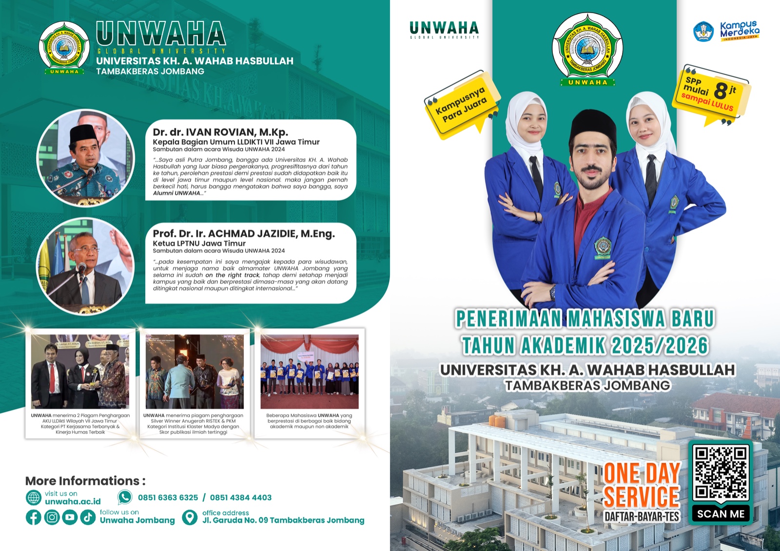 Saat ini UNWAHA Jombang membuka kembali kesempatan bagi kalian untuk bergabung dengan salah satu perguruan tinggi yang memiliki segudang prestasi dan berwawasan global.