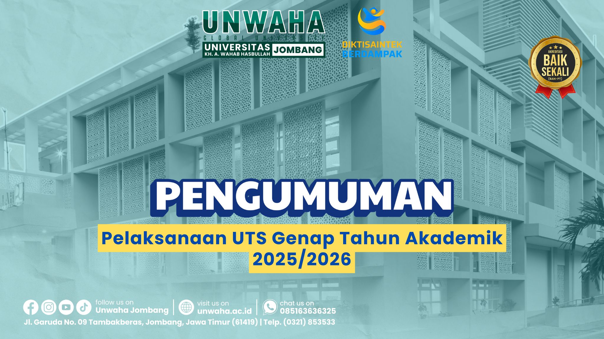 Diberitahukan kepada seluruh mahasiswa Universitas KH. A. Wahab Hasbullah (Unwaha) Jombang bahwa pelaksanaan Ujian Tengah Semester (UTS) Genap Tahun Akademik 2025/2026 dilaksanakan pada tanggal 18-23 April 2026 (sesuai jadwal perkuliahan). Adapun tata tertib UAS, dapat di lihat di surat pengumuman sebagai berikut: