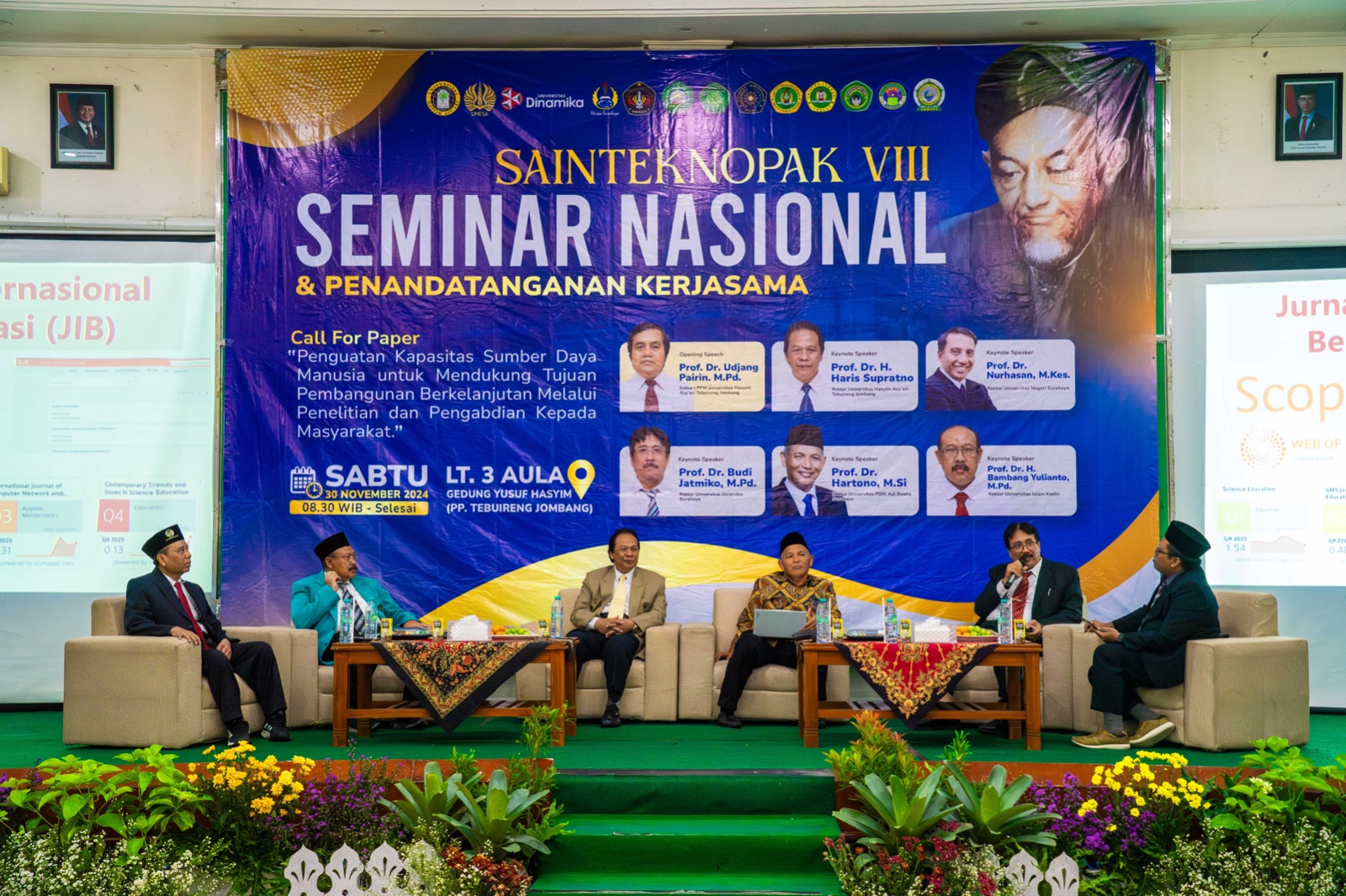 Pada sesi Seminar Nasional menghadirkan berbagai narasumber, yaitu Ketua LPPM UNHASY, Prof. Dr. Udjang Pairin, M.Pd., sebagai opening speech, Rektor UNHASY, Prof. Dr. H. Haris Supratno, Rektor UNESA, Prof. Dr. Nurhasan, M. Kes., Rektor Universitas Dinamika Surabaya, Prof. Dr. Budi Jatmiko, M.Pd.