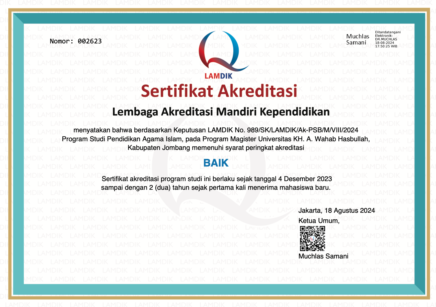 Jombang – Program Pascasarjana (S2) Pendidikan Agama Islam (PAI) Universitas KH. A. Wahab Hasbullah (Unwaha) dinyatakan terakreditasi “Baik” oleh Lembaga Akreditasi Mandiri Kependidikan (Lamdik) pada Minggu (18/8/2024) lalu.