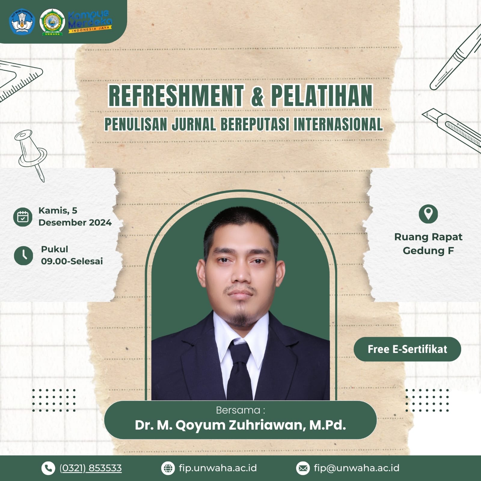 Dekan FIP, Bapak M. Farid Nasrulloh, M.Pd., mengatakan bahwa kegiatan ini menjadi salah satu upaya strategis FIP UNWAHA untuk meningkatkan kompetensi dosen dalam menulis artikel jurnal internasional dan mendukung tercapainya target publikasi ilmiah fakultas.