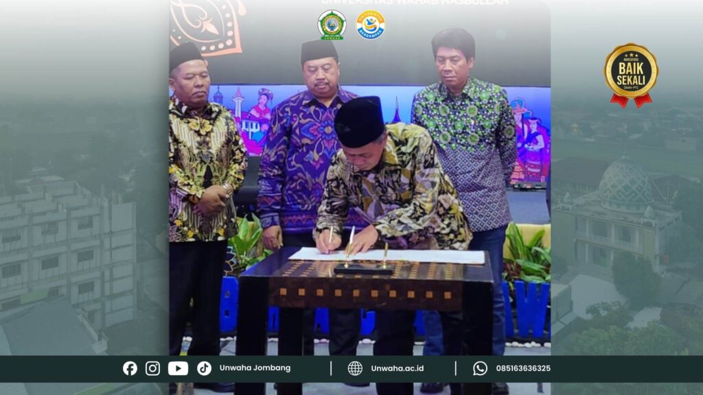 Penandatanganan MoU ini dilakukan oleh Rektor Unwaha, Prof. Dr. Ir. H. Gatot Ciptadi, DESS, IPU, ASEAN Eng., bersama Bupati Jombang, Warsubi, S.H., M.Si., disaksikan langsung oleh Wakil Bupati Jombang, M. Salmanudin, S.Ag., M.Pd.